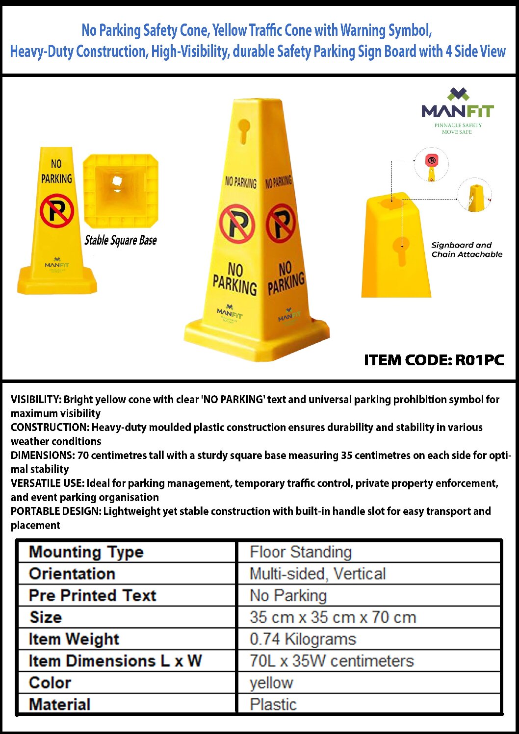The No Parking Safety Cone (R01PC) is a high-visibility, heavy-duty parking control solution designed to clearly restrict unauthorized parking. Manufactured from durable moulded plastic, this bright yellow cone features bold “NO PARKING” text along with a universal parking-prohibition symbol on all four sides for maximum visibility from every direction.